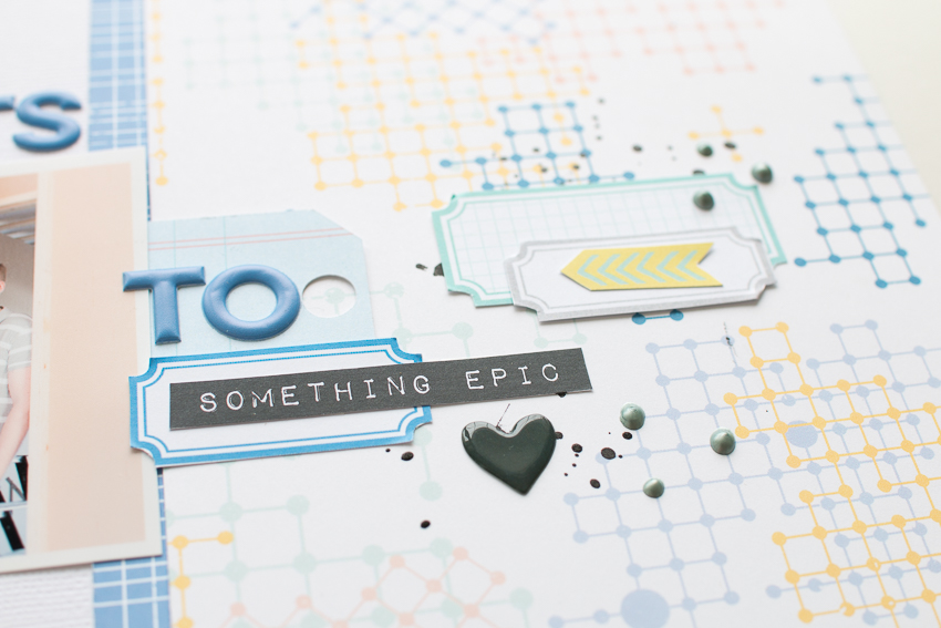 To finish off the layout I added labels from the exclusive paper ephemera sheet together with mist splatters and few Nuvo Chrystal Drops.