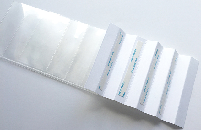Once you have created the accordion strip that will become your binding, begin to adhere your pages (in this case, your page protectors) in each dip in the fold on the right side. Don’t worry about the fact that at this point it doesn’t really seem like pages.