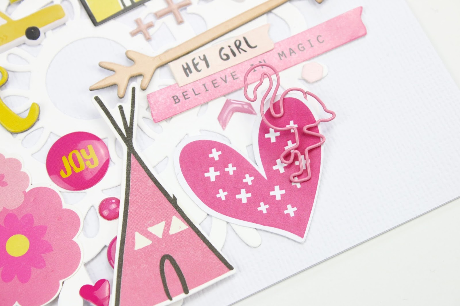 I went with using alot of the little embellishments from the kits and added them on top of the white Amy Tangerine die-cut from the Grace Box kit (all the heart eyes for those die-cuts, love them all!). And fortunately this month's kits have alot of pink and yellow for me to pick from ;)