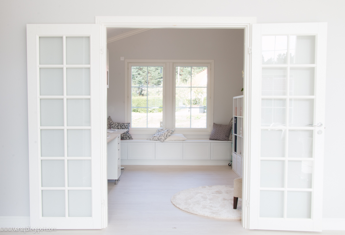 One big part of the room design is storage. I wanted to have a lot of cabinets and drawers that I could store all my scrapbooking products in. There are now three main storages areas in the room. Above the table I have 10 cabinets and half of them have a glass door. This helps making the cabinets feel lighter. The second storage area is under the window. This built-in bench with drawers is actually an Ikea hack my husband made. It’s still waiting for some cushions, but I’m already quite excited, I think the bench is really pretty! The last storage area in my studio is my trusty Kallax where I store for example all my papers.