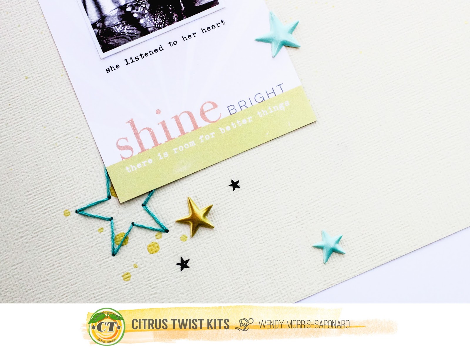Since I really wanted to highlight the theme of my layout as "shine bright", I chose to go with stars as the focal embellishment. I used various stars in different elements as puffy stickers, stamps, and my most favorite the hand-stitched stars.