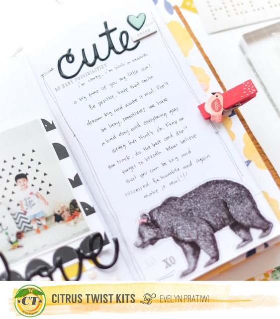 Here is my 1st TN spread! I use my TN to do memory keeping about my son, me and my coffee. But this time I create spread about him. I did layering with the ephemera die cuts behind the photo and still be able to use those chipboard. To make it balance between the right and the left side, I place the XOXO in the bottom of the page and let the white space blank like that.