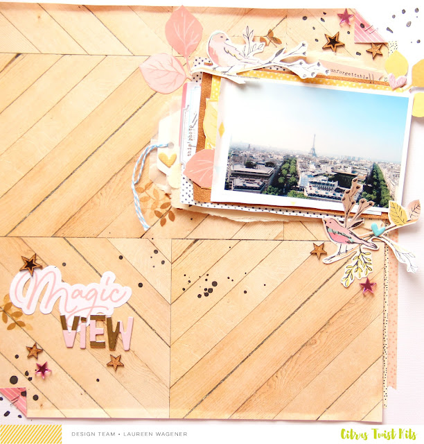 The gorgeous sketch immediately made me want to create. I used one of the Maggie Holmes Gather papers, the one with the wood grain, and created a ton of layers behind my photo.