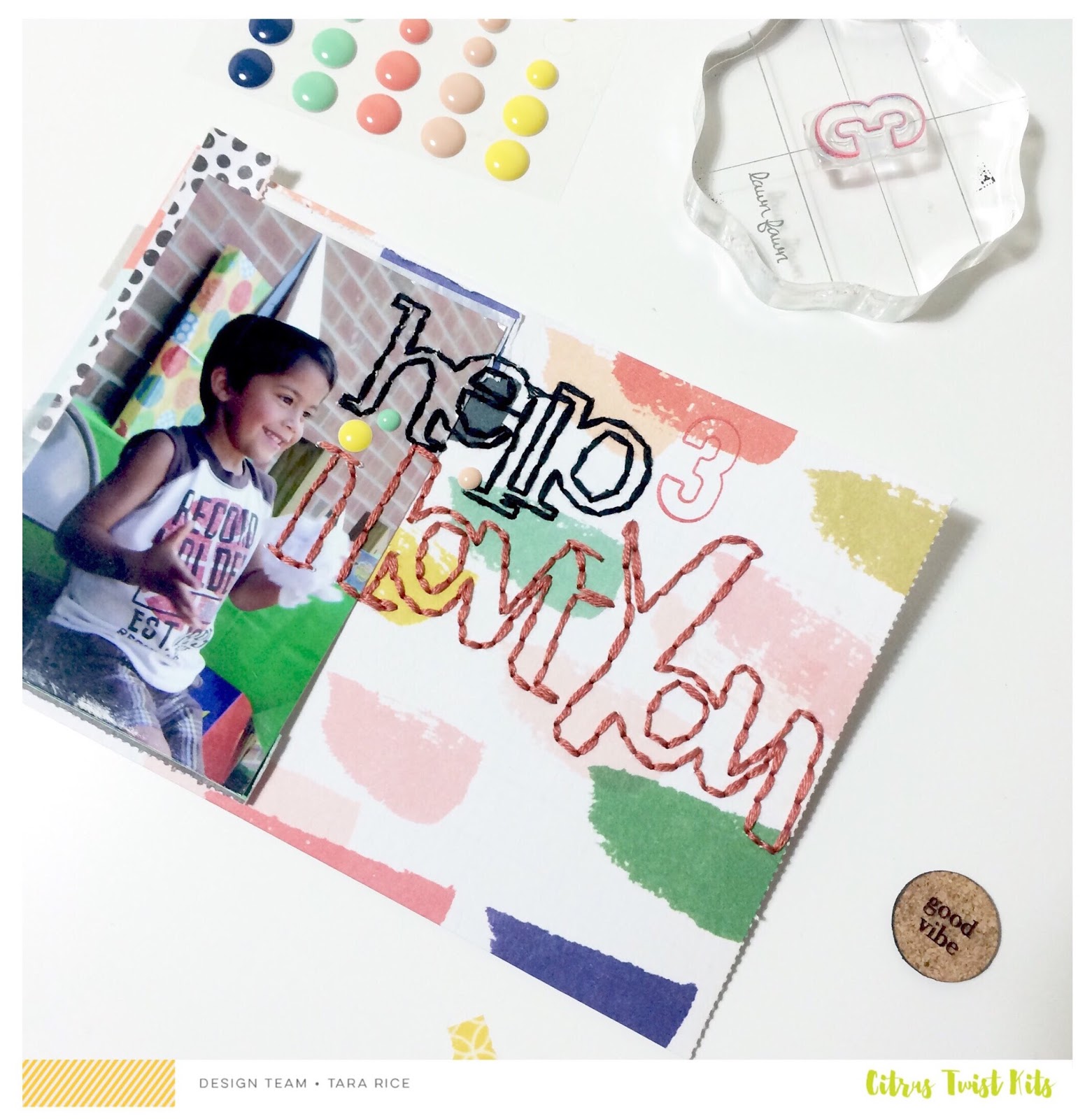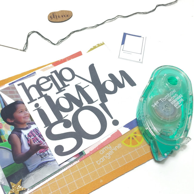 I really love the "hello, I love you" title paired with a "3" stamp from my stash documenting my son's third birthday.