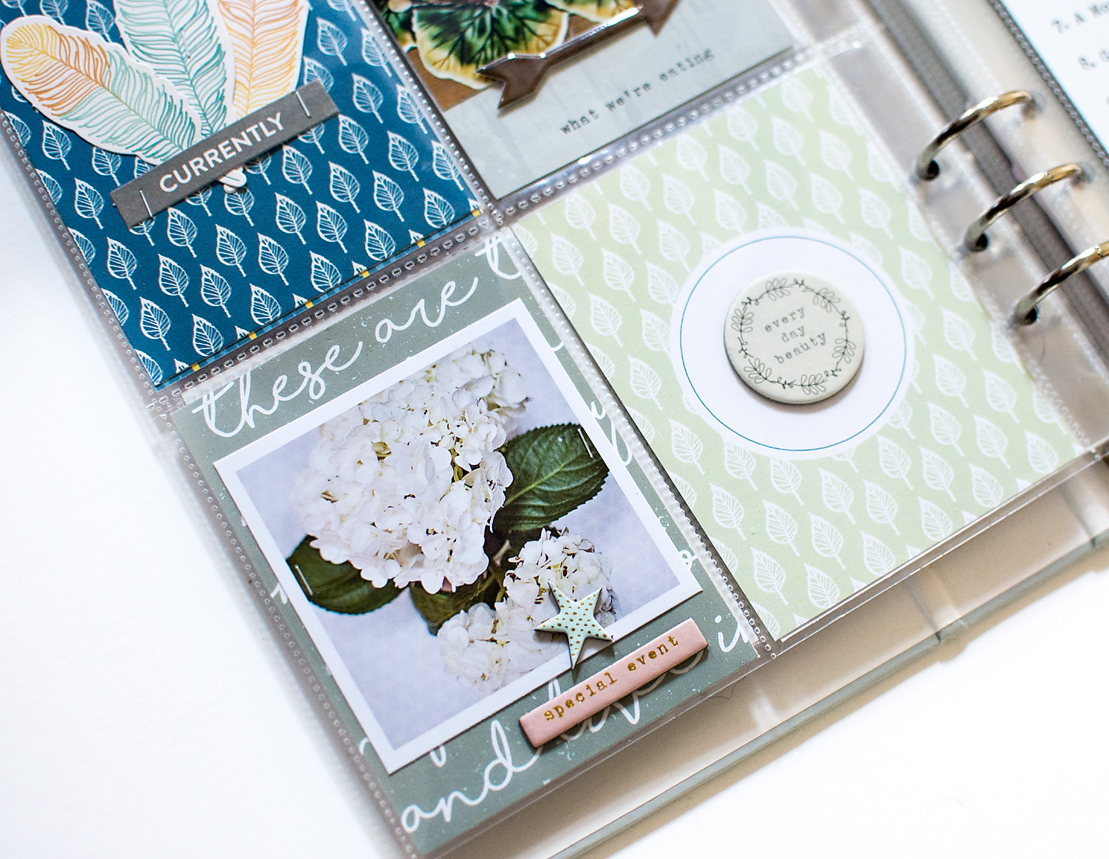 After adding in my inserts, I kept the rest of my pages fairy simple, adding embellishments straight on top of my photos and journaling cards.