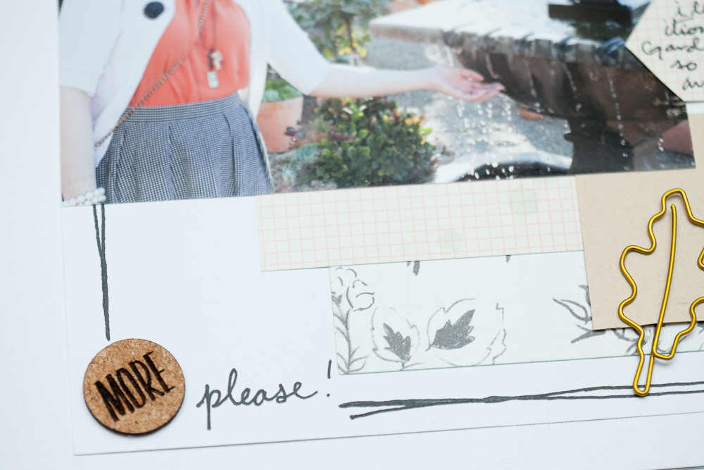 For some special fall touches to my page that help tell my story, I added some leaf shapes. I used some of the pretty black and white Simple Stories patterned paper from the kit and a leaf cutfile I designed, at the top of the page, and then one of the beautiful gold leaf paperclips from the Sprinkles kit, at the bottom of the page.