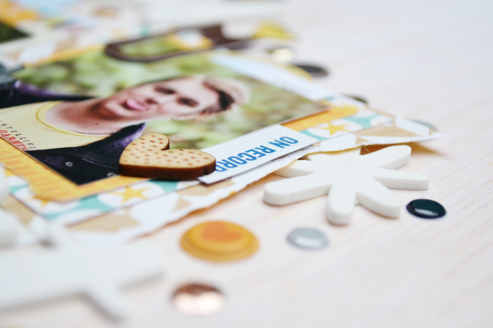 I knew I wanted to use those white foam thickers that said 'Wild About You' for my title but wasn't quite sure about the placement. I separated the words to make the layout a little more interesting to look at.