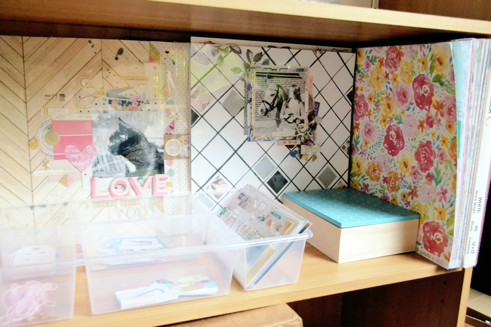 One of the things I like about using my bookcase for storage, is that you can always see the scrap items (which makes me really happy because it's all so pretty) and it makes the room look a lot more interesting and personal. I also like to put some of my layouts on display. This can either be a recent layout or a layout with a photo / background story that means a lot to me.