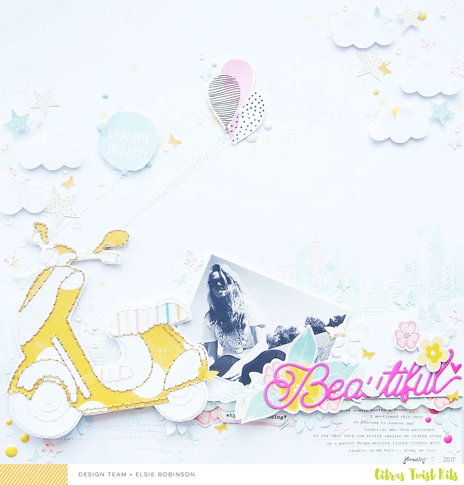 I carried on that tone-on-tone thing by clustering the Simple Stories enamel dots around the balloons, Vespa and 'Beautiful' title, they matched perfectly with the papers and ephemera in the kit and so I was really happy with that!
