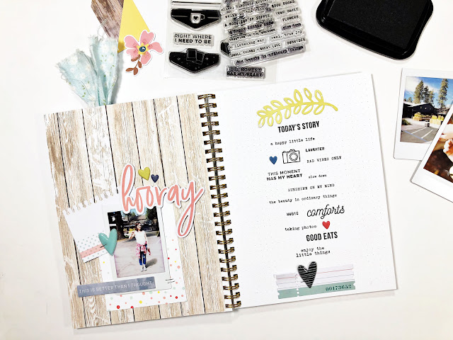On the opposite page I built a fun photo cluster using cards and die cuts from the gorgeous Little Things kits! The wood grain background is from the 6x8 papers and I basically want all my backgrounds to be this pattern!