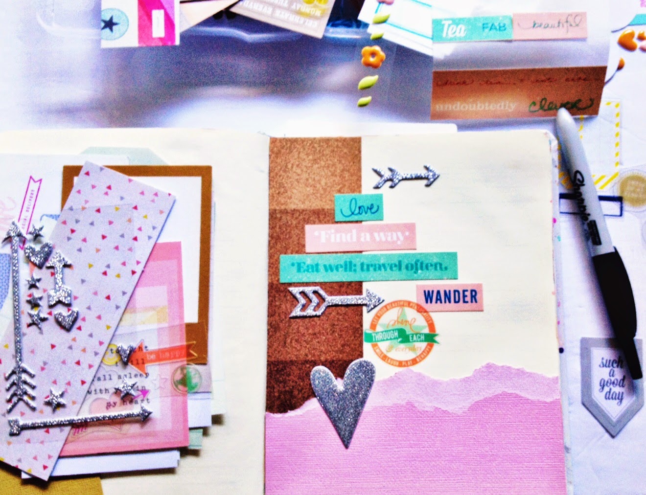 I also like to take a few detail shots. For these I get down right next to the layout and shoot a few pictures with a lower aperture, typically f2.8. I like to do this so you can see the dimension in the embellishments that I've used.