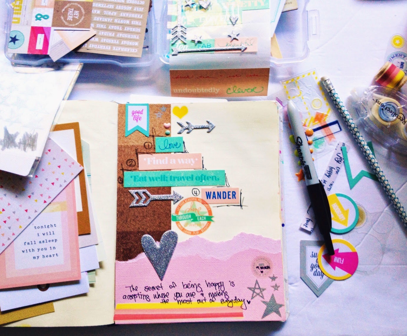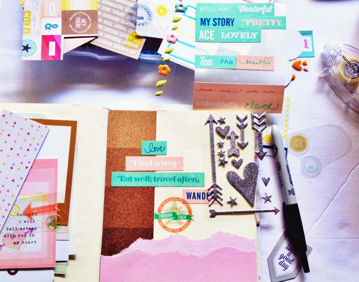 Stand straight above the layout and shoot. I take about 5-6 photos so I know that I will have at least one good shot!