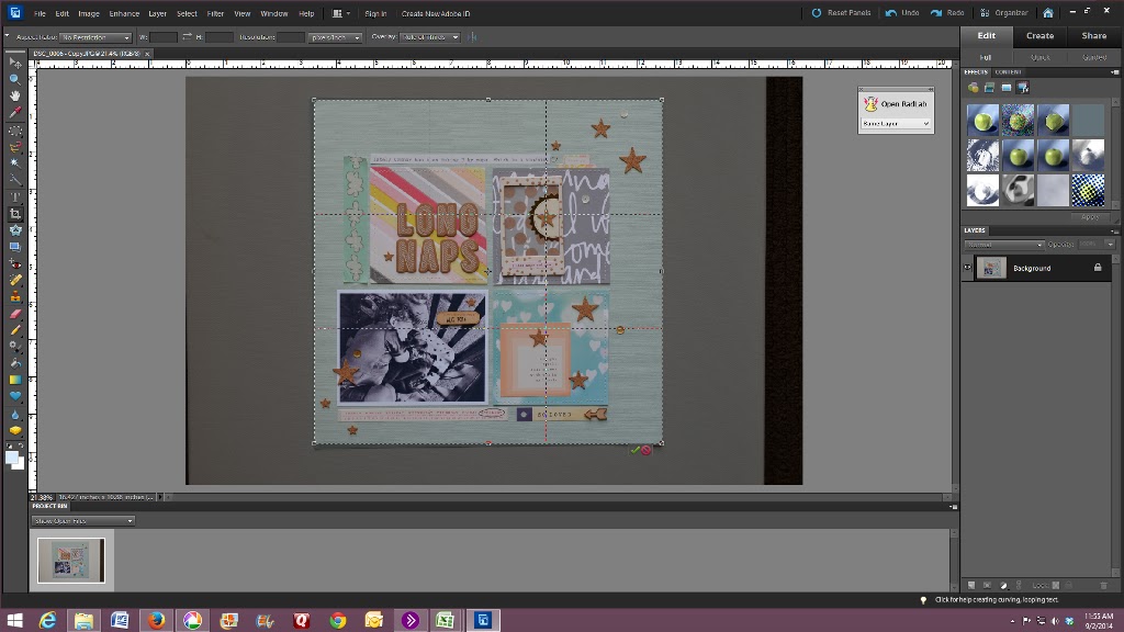 After opening my layout in Photoshop (I am currently using PSE10), I use the crop tool to crop out the white background. You can also take this opportunity to straighten the layout if needed.