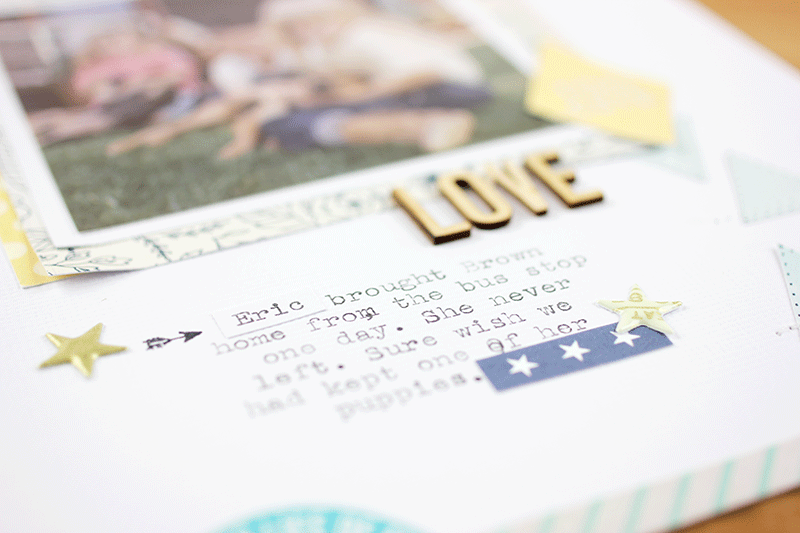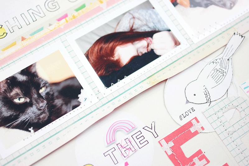 Now for the close-ups of my layout. This first photo shows my fussy-cut title. I wanted to mix some of the pattern papers from the April Main kit "Flight of Whimsy" (presale begins tonight and reveal happens tomorrow night):