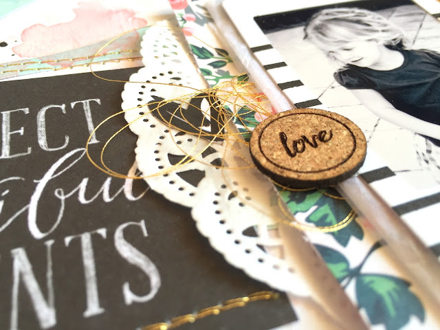 I love these fun tab pieces from Pink Paislee! They are perfect for layering and adding details to your layout. This fun doilie gives such a feminine look to a page. I used a blue colored gelato here to add a hint of blue to this side of the layout. I also used my sewing machine here with some shiny gold thread.