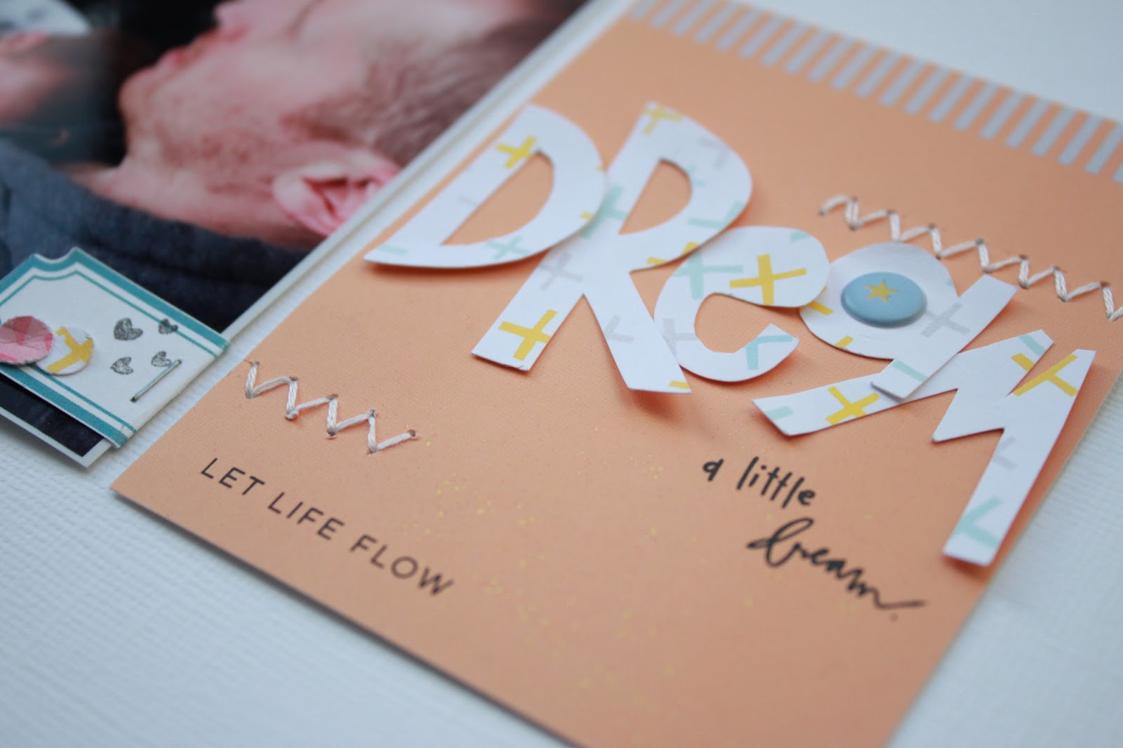 I LOVE the exclusive CTK patterned paper in this month's Pocket Life Kit! I used it to create the "Dream" cut out. I had grand plans to add a lot more stitching but I felt just a few pops here and there were perfect! I also re-purposed one of the 4x6 jounaling cards in the kit and made it a 3x4 card for my title. The puffy sticker on the letter "a" ties into the challenge too.