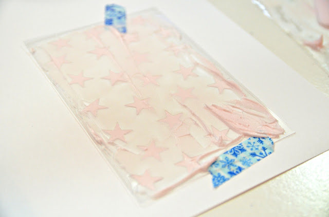 I decided to grab another piece of white paper, draw and cut a half-moon and star design, hand-stitch around them and back it with the mixed media page.
