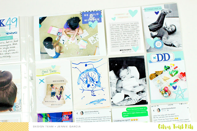 The majority of my album relates to the elf and his daily antics. We don't typically do a whole lot of "Christmas-themed" activities during the month (other than the crazy shopping) but we do have our elf, Freddie, and he is always entertaining so I include everything he does in my album. All of my journaling is typed up on the computer (using a typewriter font) because I'm not too fond of my own handwriting. Actually that's not true, my handwriting is fine until I put it on a scrapbooking page, and then I think it makes it look messy, haha. Weird but true.