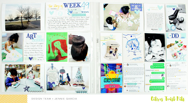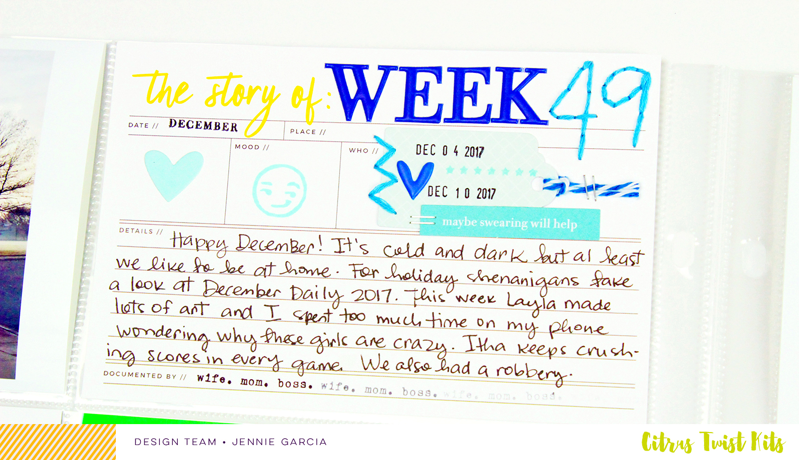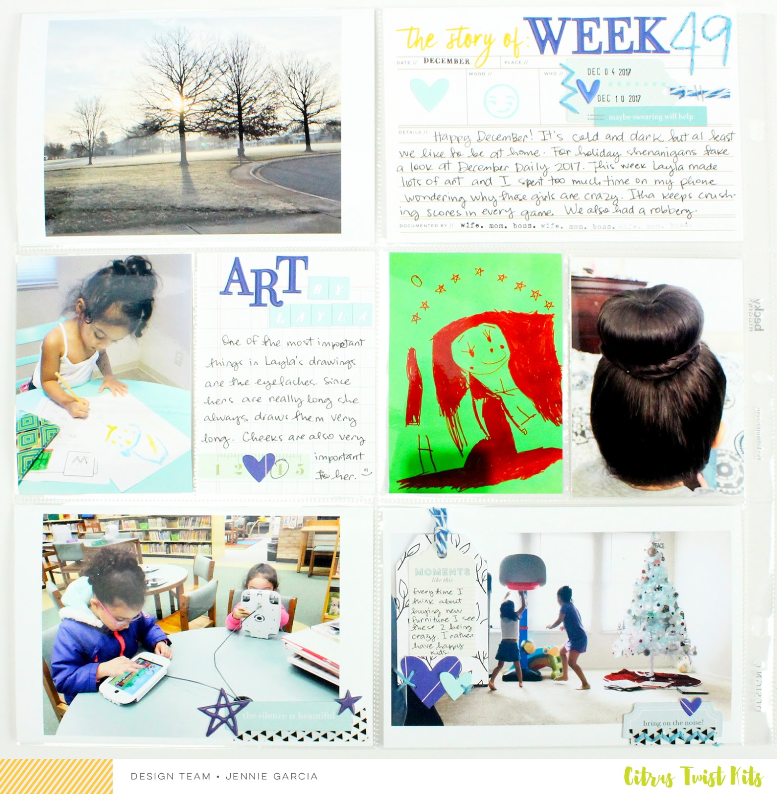 Hello friends! I hope your holiday was fantastic and the new year brings lots of lovely memories to document. For todays spread I worked on week 27 in my 2017 album. The colors in this month's kit were a perfect match for my photos and theme for my week. Here is a look at the final spread!
