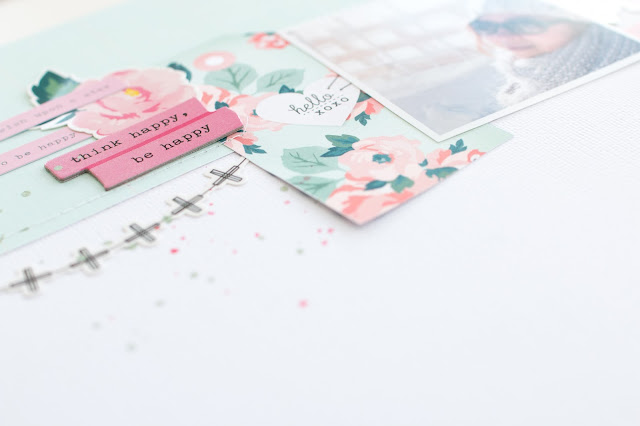 For this layout I used February main kit and embellishment kit. I used pink as my main accent color using pink word stickers and those beautiful pink flowers. As the top part of the layout is full of embellishments I balanced the layout by using a lot of white space.
