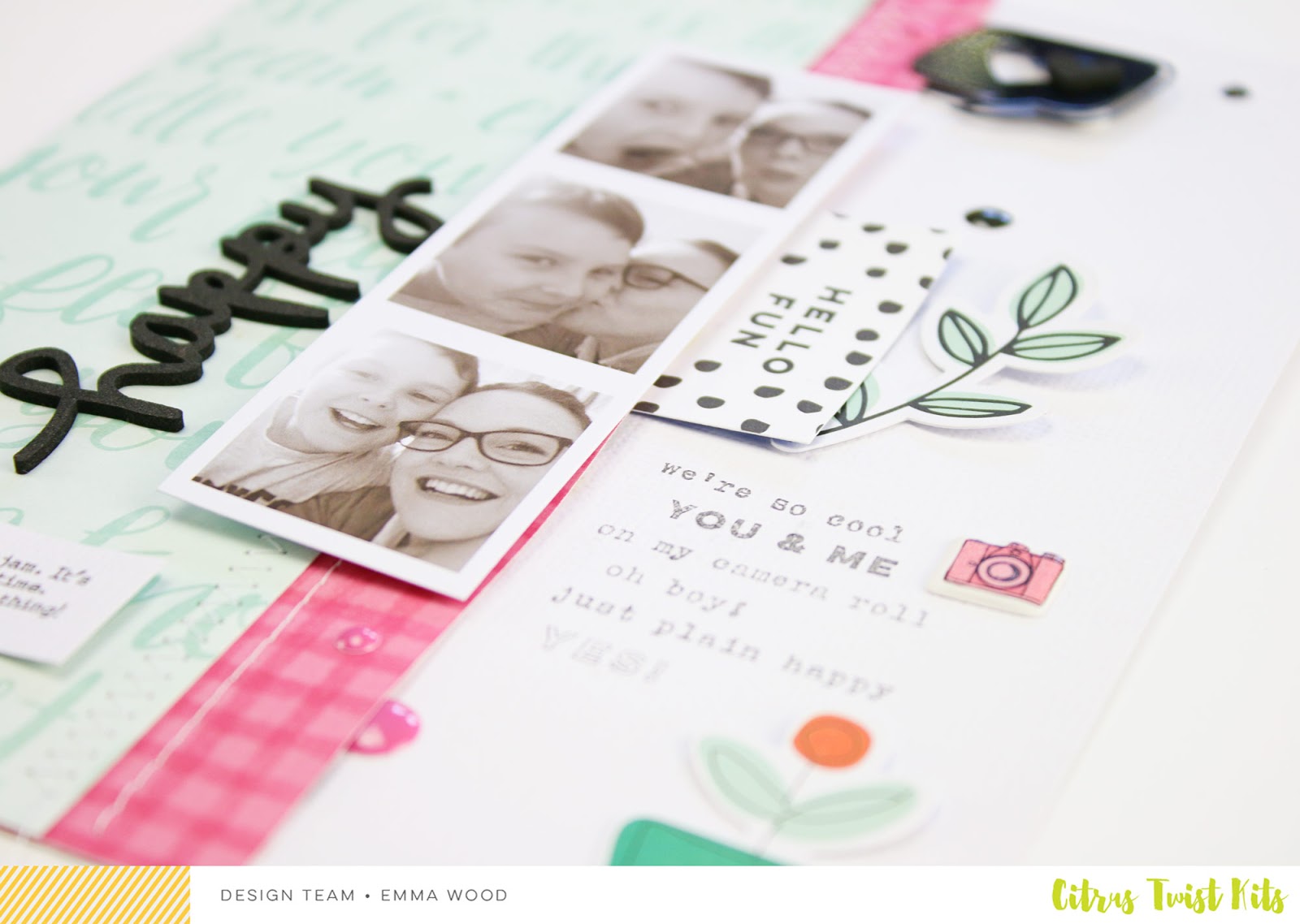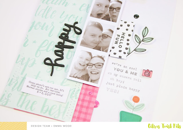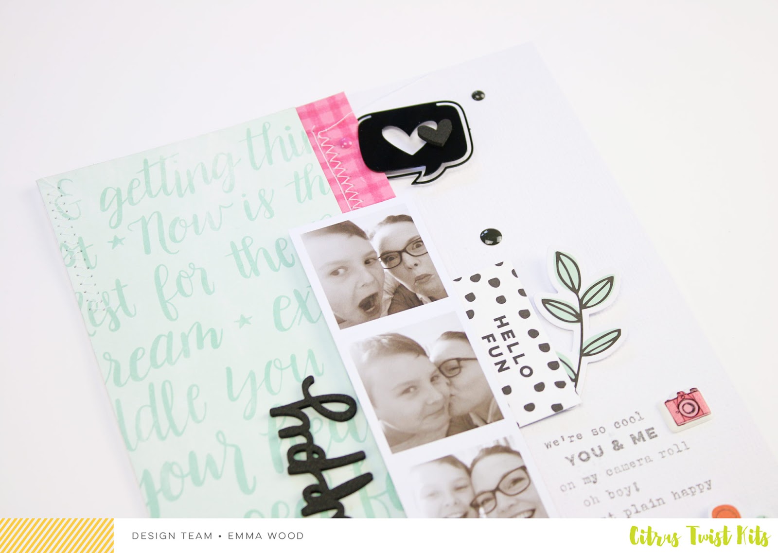 Also, when using embellishments with a whole in it, like the heart and the arrow here on the right page, pay attention to what will show through that whole. It would have been awkward if the arrow would have been placed a little more down, letting show and amplifying the gap between the blue paper and the photo under it for example.