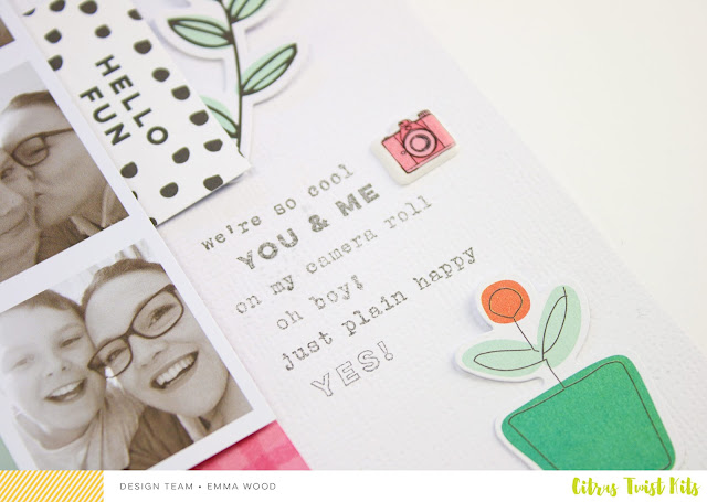 When adding small embellishment, add them close to your basic elements that form the page. Here you see that I overlapped the camera on the orange paper. Same thing with the cork embellishments on that next photo: