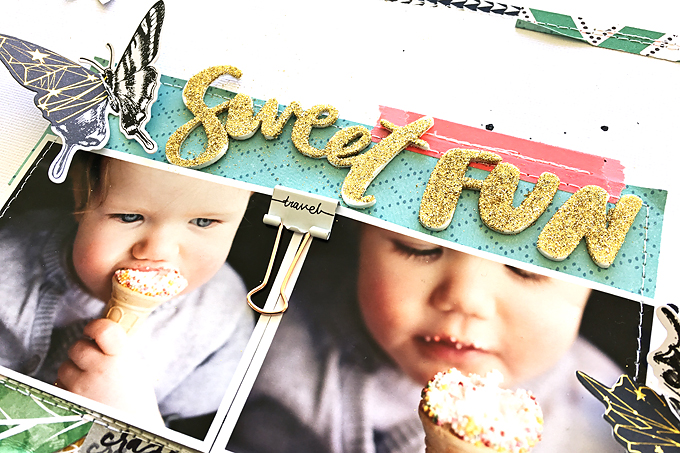 I did also have to glitter the title to match the page. While white to begin with I really liked the gold words in the packet, so I gave my title a coat of PVA glue and went to town with the glitter. I really like that it's a bit patchy. Suits the patches of sprinkles stuck to my child in the pictures.