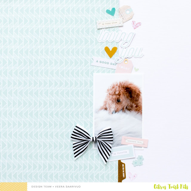 In this card I used my typewriter. All the little hearts on the layout where made with the 6x8 Exclusive Citrus Twist Pattern Papers and a metal die.