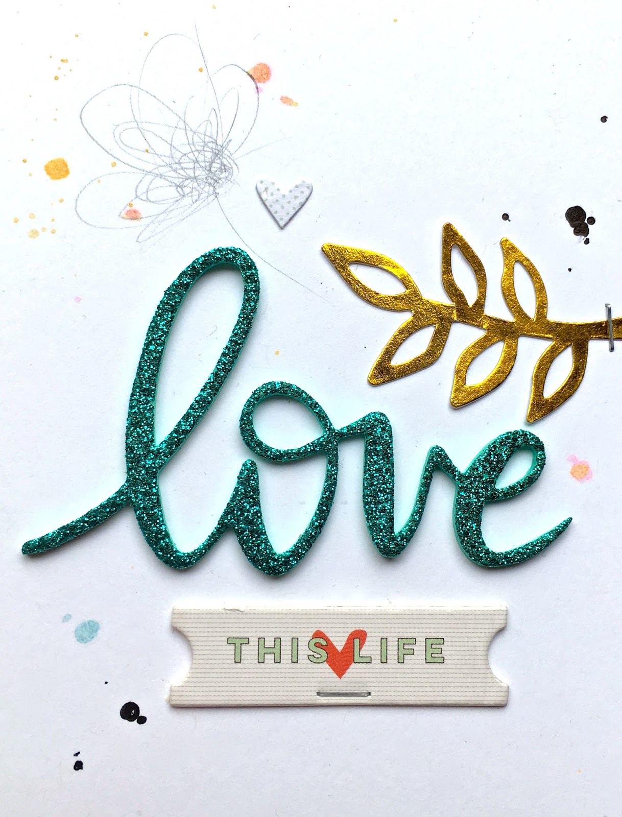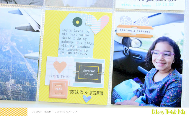 I love these puffy stickers from the Pocket Life Kit they are the perfect amount of puffy for PL pages. I used a bunch elements in this card: pattern paper, die cuts, cut aparts, puffy stickers and stamp. This is my favorite card in the spread.