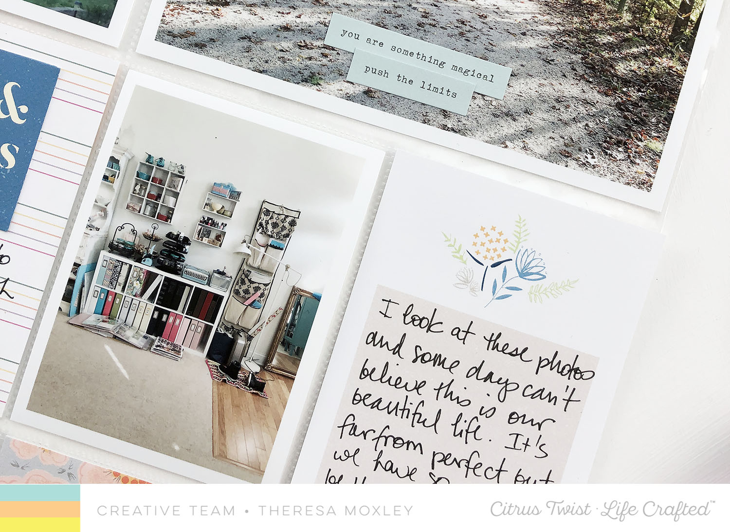 5. Leave one photo or journal card (or both!) unembellished. It can be really tempting to want to put all the things on all the pockets, but it can be really freeing to leave something just as it is. Of course, this allows that element, whether it's a photo or a journal card, to stand all on its own, just as it is. In the photo above of my studio, you can see it needed no journaling or embellishment, just the photo itself that captures a moment in time. There is incredible beauty in that!