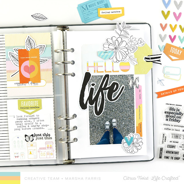 To begin the spread, I trimmed a piece of white cardstock to 5" x 8.25" to fit as a full page in the album. I printed a photo I took on a recent errand day and added it to the page. I am determined to get more of these little everyday stories documented this year! For the title, I backed a tag from The Stamp Market Miss Modern collection (from the Add-on kit) with a fun striped patterned paper from the LC kit. I let the tag hang off of the edge of the page. I love the bit of extra interest and fun this adds to the spread. Next, I added the "Life" die cut over my photo to complete the title. To embellish the page, I added some tab ephemera pieces from the LC kit and some beautiful black and white floral die cuts from the Pinkfresh Studio My Favorite Story collection, found in the Add-on kit. I also added a heart and butterfly puffy sticker.
